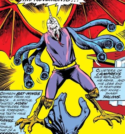 The Headmen return in this collection although their name was in the last collection’s title. This collection helped to cement the ongoing story together for me since I had a bunch of these issues, but I was often getting only every-other issue when I was a kid. There’s a lot of brain-swapping and mind-swapping that goes on in these stories. A particularly nutty part is when Dr. Strange places Chondu the Mystic’s consciousness into a fawn that Hulk brought in (calling her “Bambi”). In deer-form, Strange thought that Chondu would be unable to utter incantations or gestures, but the little possessed deer could still summon some mystical mayhem. Later, the Headmen transplant Chondu’s brain into a one-horned winged creature with eight lampreys for arms, bird-feet, and a forked tongue:
